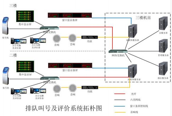 一樓、三樓辦事大廳各設(shè)置為一個(gè)叫號區(qū)域配套大屏幕電視機(jī)。一樓、三樓區(qū)域安裝取票機(jī) 1 臺,二 樓區(qū)域安裝取票機(jī) 2 臺。各配套大屏幕電視機(jī)進(jìn)行信息集中顯示,以及音響系統(tǒng)進(jìn)行語音提示。各區(qū)域根