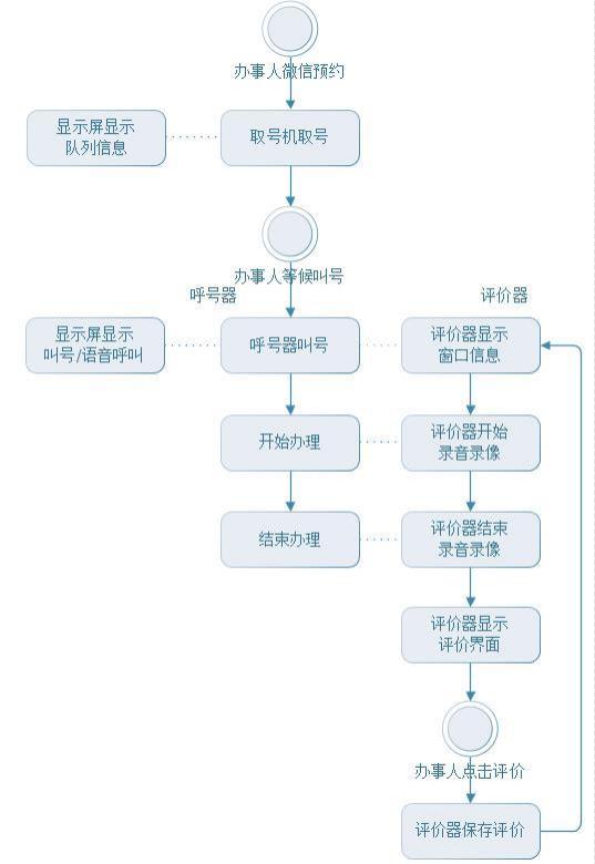 排隊(duì)叫號及服務(wù)評價(jià)系統(tǒng)工作流程圖: