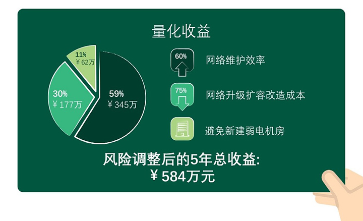 擴容建設(shè)投資:網(wǎng)絡(luò)升級擴容基于POL簡架構(gòu)、光纖輕便靈活可以節(jié)約75%建設(shè)投資,五年總收益現(xiàn)值超177萬元人民幣。